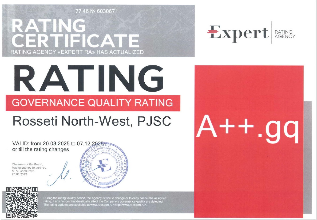 «Rosseti North-West, PJSC has the Corporate Governance Rating at A++.gq (Highest Level of Governance Quality).